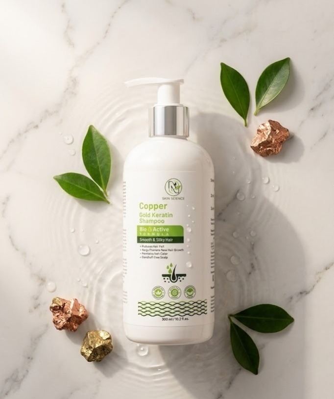 Copper Gold Keratin Shampoo is a scientifically developed hair care formulation designed to cleanse the scalp, restore keratin balance, and strengthen damaged hair strands.